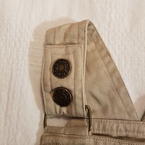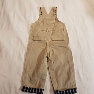 EUC IZOD tan overalls sized 18 months, no defects or signs of wear, 2 shoulder metal snaps, metal snaps at the waist, 5 pockets, the back ones have hook and loop touch closure, the bottoms of the legs are folded over with a plaid cuff, snaps around the inseam.