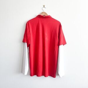 IZOD Extreme Function Golf Polo Double Sleeves Red White Men's Large. Short sleeved red polo with white long sleeves sewn into the shirt, for those cooler days. Very good used condition - a couple snags - see photos. Please see photos for approximate measurements. 100% Polyester.