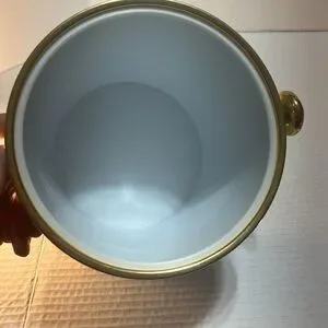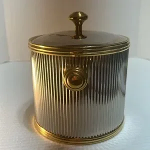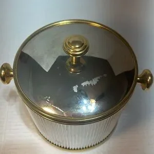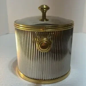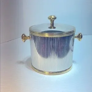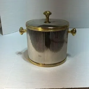 This elegant MCM ice bucket features a sleek silver body with luxurious gold accents. Perfect for entertaining, it adds a touch of sophistication to any dining setting.