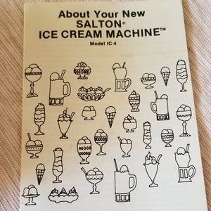 Salton machine, makes 1 Qt. of ice cream, yogurt or gelato. For use in the freezer. Comes with the manual and some recipes. Works great.