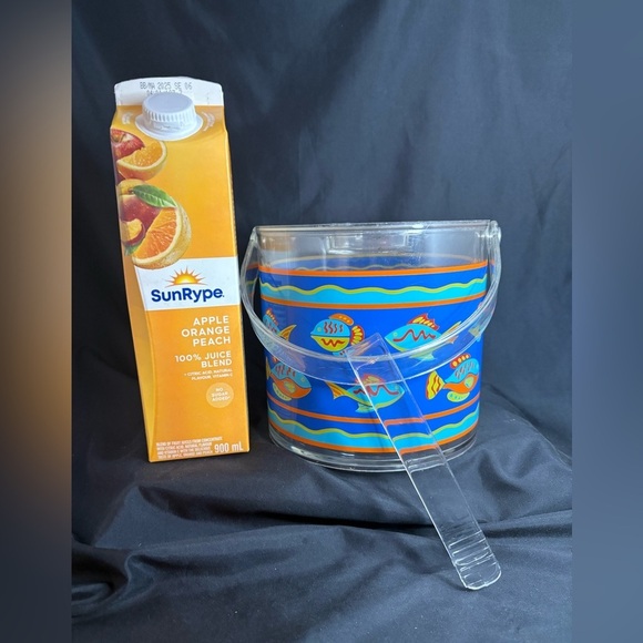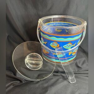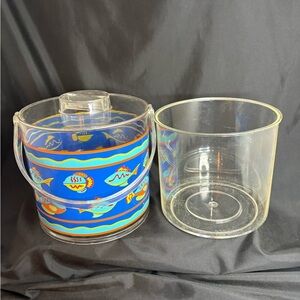 Ice bucket with tongs and insert. Measures 7” wide x 12” high including the handle height.