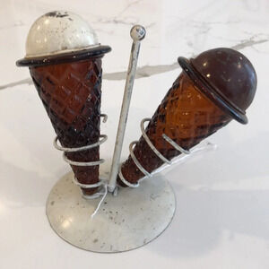 Ice cream cone salt and pepper shakers vintage 1950’s Amber glass with nesting station