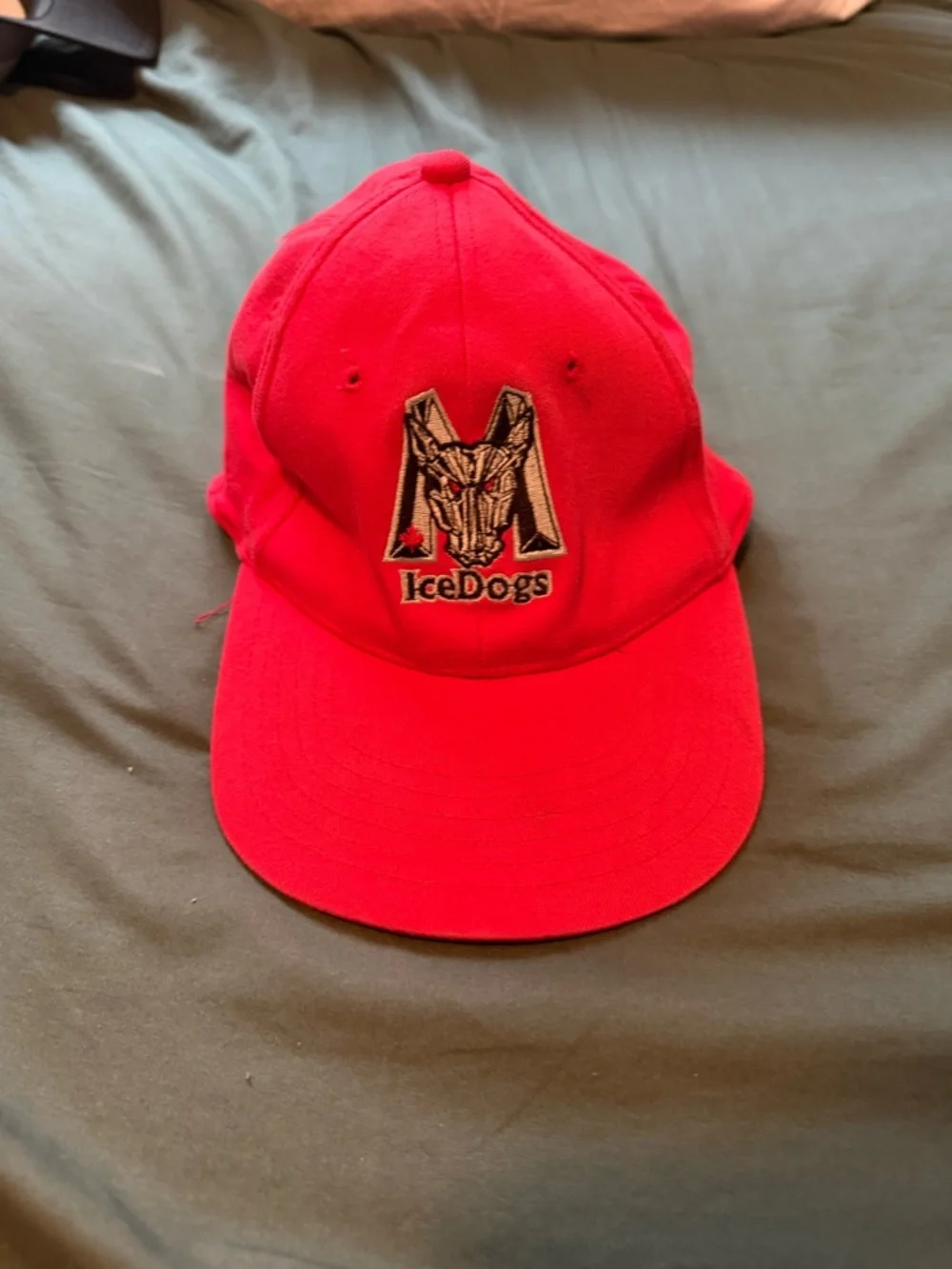 Bright red baseball cap with embroidered IceDogs logo on front. Structured crown and curved brim. Bold team-style design. Ready to wear.