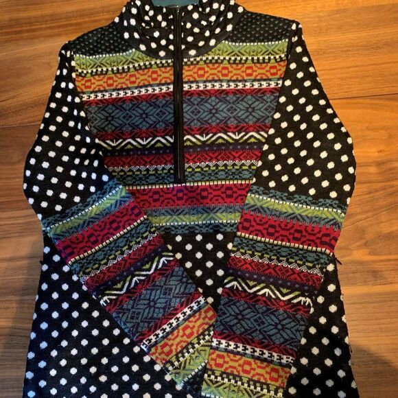 Icelandic Designs 1/2 zip sweater in 50/50 wool- acrylic blend in size medium. Excellent used condition with no wear, stains or damage detected. Gathered mock turtle neck, long sleeved, invisible slash side pockets, medium weight knit. Gorgeous colours and traditional Fair Isle style patterns set off and elevated by fun black and white polka dots. Layer under a favourite vest or jacket or over layers for winter outdoor active wear, perfect on its own for cool weather wear. Style it your way with pieces from Our Closet (some suggestions shown, all listed and priced separately), make a bundle, save a bundle. Fresh for you from Lemon Squeezy Shop🍋