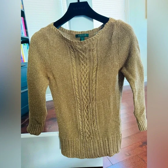 Beautiful cotton Ralph Lauren sparkly gold sweater - looks even better in person. So comfortable and can wear with anything to elevate your look. High quality lasts forever
