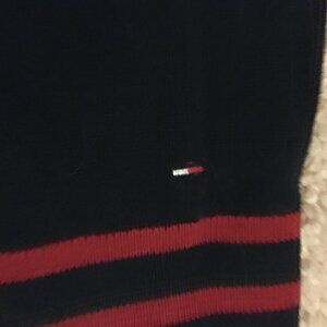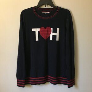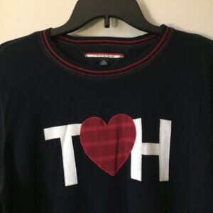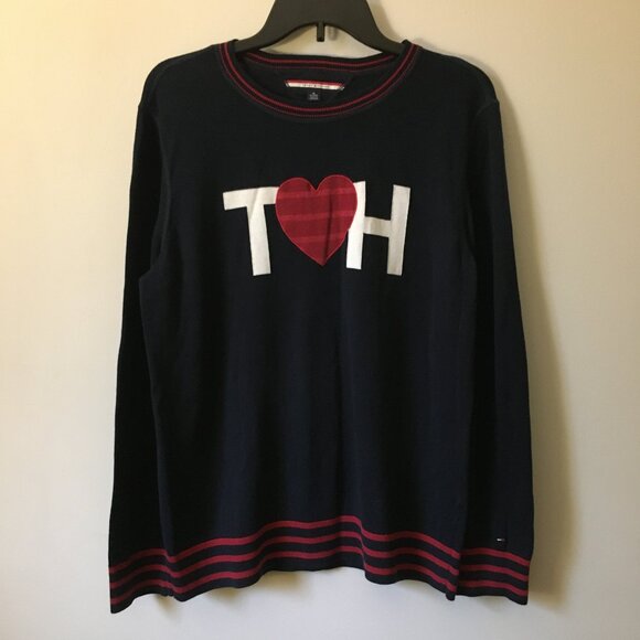 Good preowned vintage condition, dark navy blue, crewneck sweater with red stripes around hem, collar and cuffs by Tommy Hilfiger. Features a red heart between a 'T' and 'H'. Iconic.