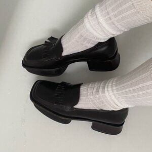 Very rare split-sole loafers from Miuccia Prada’s Spring 1999 collection with split sole platforms and front leather fringe detail. The mules are a beautiful chocolate brown/dark brown colour, almost black.