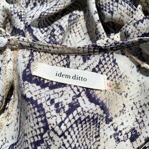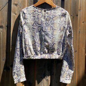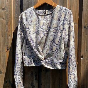 Chic and subtle cream blouse with a snake print pattern. Features a ruched front hem, soft, flowy silhouette, and long sleeves.