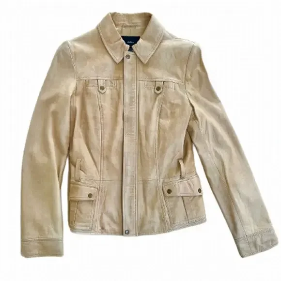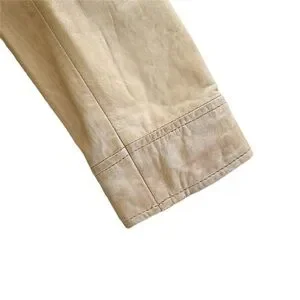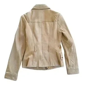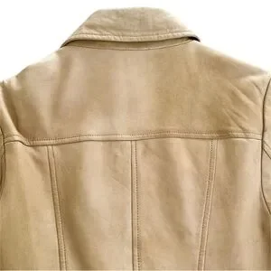 I really really really reallllllly love this jacket so much but I'm just not wearing it enough. It deserves to be loved more often! This leather is just buttery soft, I'm not sure but I think it's lamb. As leather does, it's beautifully aged naturally with variations in color. The color is tricky to describe. It's almost a golden tan, but not yellow. Like a buttery warm camel color. I love all the special details and how it fits. It's just so classy. I'd wear this as a jacket obviously, but it could also be worn almost like a blazer with trousers too. Please note, theres a water stain on the belt. I never wore it with the belt so I'm not sure how it got stained, but if you did want to use the belt I'd get it dry cleaned. Aside from that I'd say it's in perfect condition. Please do expect the leather to have slight variations in color.