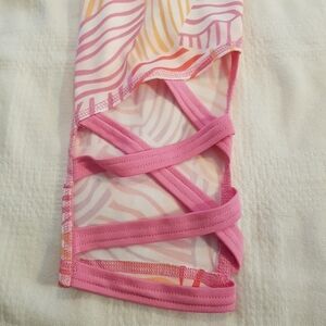Ideology girls XL size 16 full length leggings, criss cross at the back of the legs, pink, purple, white and coral stripes, price tag US$$ no defects