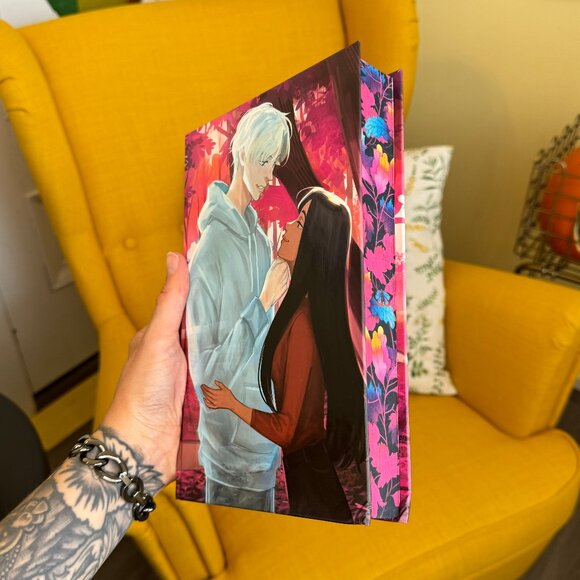If I Have to be Haunted by Miranda Sun has an exclusive cover, a reversible dust jacket by @sallteas, a digital sprayed edge with solid sprayed top and bottom edges, artwork on the hardcover by @_panprika, foiled artwork on the endpapers, a digital signature, and exclusive bonus content.
