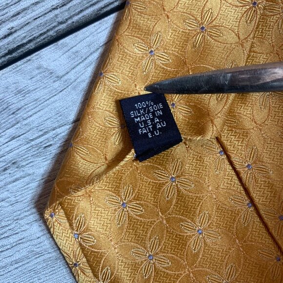 Elevate your attire with the Ike Behar New York Silk Tie, a refined choice for any sophisticated wardrobe. The tie features a lustrous gold hue with a geometric floral flower print that adds a touch of elegance to your business or formal wear. Crafted from 100% silk, this tie offers a luxurious feel with a classic weave that ensures both comfort and durability. The designer tie measures a standard classic length of 57 to 60 inches and showcases a timeless width that complements a variety of shirt styles and suit combinations. It's an essential accessory for professionals seeking to make a statement of preppy charm and academic prestige, suitable for college events, weddings, travel, or abstract and money-themed occasions. Proudly made in the United States, this tie is a testament to quality craftsmanship.