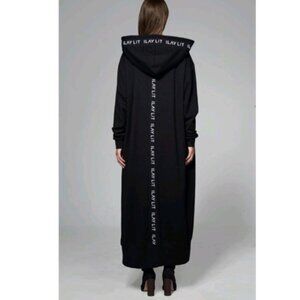 Chic and comfortable black long sleeve dress / cardigan featuring a hood and elegant lettering detail. Ideal for casual outings or relaxing at home.