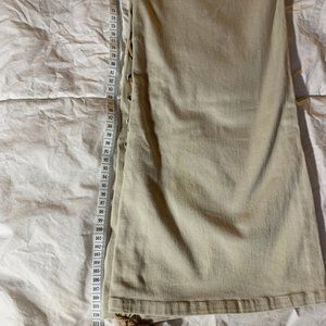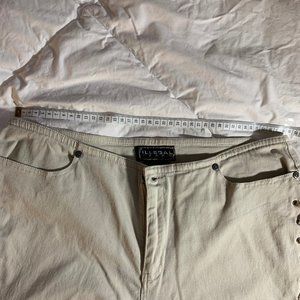 Bought new online, last photo = 2 tags that came with the pants. I washed it, didn't even try it on, and forgot it in my closet. So they are new except that a small wooden ball is missing on one of the laces in the lower left leg.Here are the measurements : exterior length = 110 cm, interior length = 83 cm, straddle = 26 1/2 cm, waist = 40 cm and hips 48 cm.