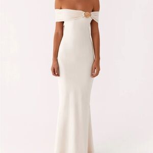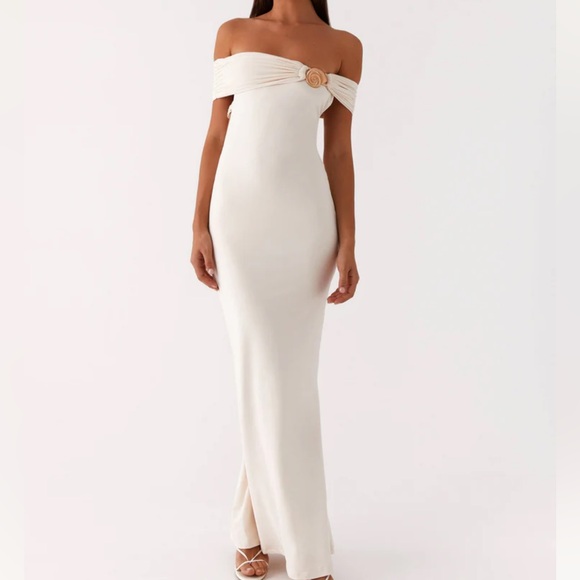 The Illusion Maxi Dress features an off-shoulder neckline with elegant shoulder ruching, creating a dramatic yet sophisticated look. The front metal embellishment adds a touch of edge to this flowing, figure-flattering silhouette, making it the perfect statement piece for any special evening.
