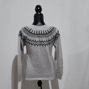 Immagini long sleeve pull over sweater. Light weight. Made in Italy. Grey with a Fair Isle pattern. It is marked a size small. 40% acrylic, 30% nylon polyamide, and 30% mohair. There are not any stains, tears, or holes. Minimal wear from normal use. Very good, gently used condition.