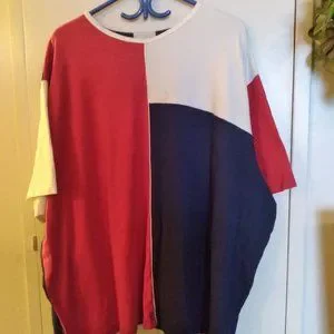 Imogene's, T-shirt with Block coloring, Red, Navy Blue and White, Size 5X but fits larger, has small mark not very noticeable, Very Comfortable, 50% Cotton 50%Polyester, washed in cold hung to dry