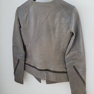 This soft and luxurious designer leather jacket from ImprovD is in excellent pre-loved condition. With stitched details throughout, a full lining, and a detachable bottom panel, this amazing piece in a dark olive green/khaki colour makes a statement. Featuring zipped front pockets, zipped sleeves, and a two-way front zipper, it can be styled in a variety of ways. A size Medium, it fits on the smaller side, like a US 4/6 (see measurements below). There is one small thread flaw on the front as shown in pictures, but it does not detract from the look. Originally priced at $995 and worn only three times, this is a great bargain!