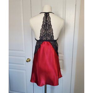 - In Bloom high shine satin babydoll style chemise in red with black lace detailing, side cut-outs and racerback. Size S