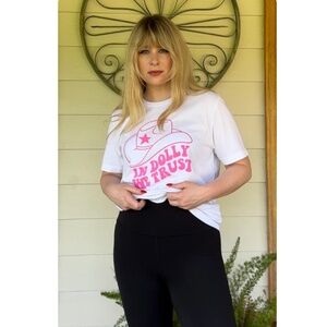 • Country western retro style Dolly Parton tee shirt with front decal that reads ‘In Dolly We Trust’