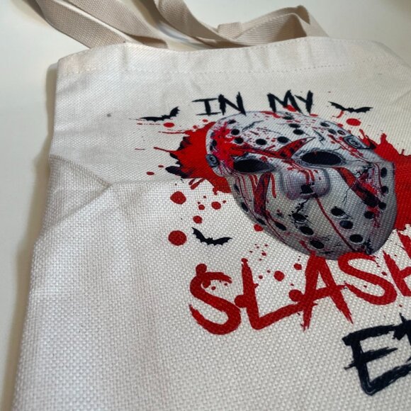 White canvas tote with bold horror-inspired “In My Slasher Era” design featuring a graphic mask, blood splatters, and bats