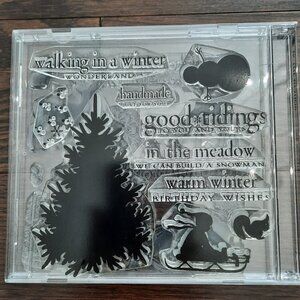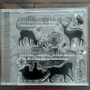 Multiple clear cling stamps featuring winter and Christmas text as well as tree, deer, snowman, birds, squirrel, rabbit, snowflake, and a child on a sleigh stamps.