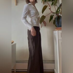 Elegant and timeless InWear high-waisted trousers in a rich cocoa brown. These wide-leg pants offer a flattering silhouette with a structured yet flowy drape. Danish design meets classic tailoring – perfect for both workwear and elevated everyday looks.