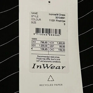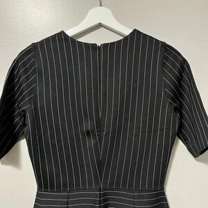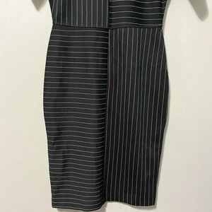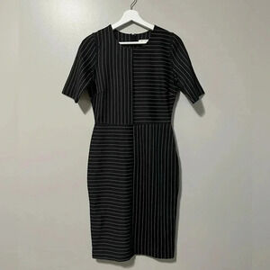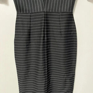 New! Black with white pinstripes. Rounded neckline. Zipper back closure. Stretch. Knee length. Composition : 57% Viscose, 23% Nylon, 16% Polyester, 4% Elastane