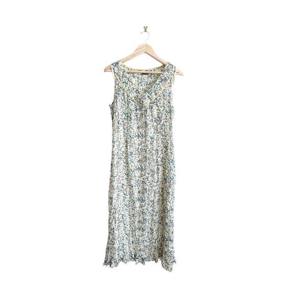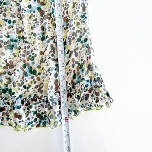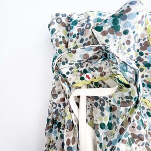 InWear Sheer Maxi Dress with Separate Lining. Ruffled, Lime Green RickRack Neck Detail, Women's 12. Creamy white with multi-coloured dots. Side zip. Flowy. The lining garment has snaps holding it to the dress shoulders - one of the snaps is missing. Very good used condition. Please see photos for approximate measurements.