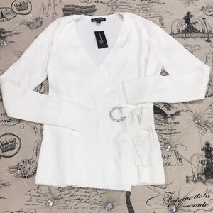 Fitted; hits at hip V-neckline Wrap silhouette; tie with embellished-rhinestone grommet
