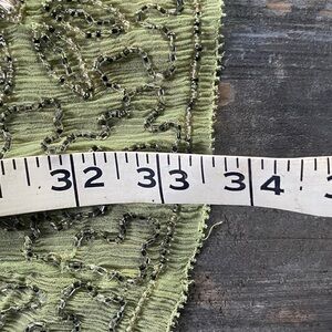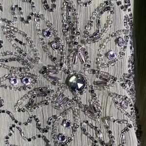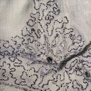 The dress/skirt has spaghetti straps which are a unique pale purple/blue and just slips on. The fabric is light and like a crinkled chiffon. The bead work is out of this world and definitely gives it some weight. Raw hems keep that bohemian look while attending elegant events. There a few random snags/threads, but nothing that isn't par for the course with such a delicate and intricate piece.