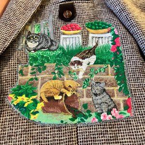 For the kitchy cat lover! This blazer is a one-of-a-kind piece. Details galore! Cat patches on the lapel, breast and back, as well as golden paw prints up the front and rosebud buttons. Some tiny imperfections as shown in a photo. Sure to be a conversation starter wherever you wear it! Wool. Fits like a ladies medium.