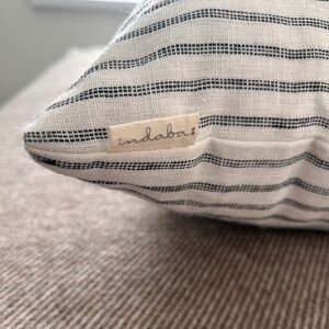 White with thin black stripes. Pillow insert included. Zipper closure on bottom.