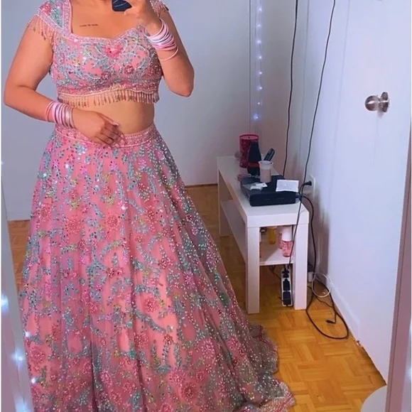 Indian lehenga worn once still in new condition comes with skirt, top and dupatta skirt can fit size small, medium and possibly large there’s no drawstring but there it’s clasp and zipper top can fit up to size large zip on side drawstring back I did have it open 2 inches top is padded located in Toronto can do a deal please msg I cannot ship skirt has big can can