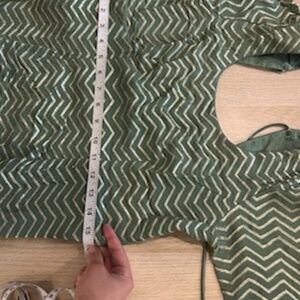 Perfect condition. Blouse measurements are included in the pictures. There is a 1.5 inch room inside the blouse for alterations to make it loose. Im 5’3 and wore this lengha with 2 inches of heels.