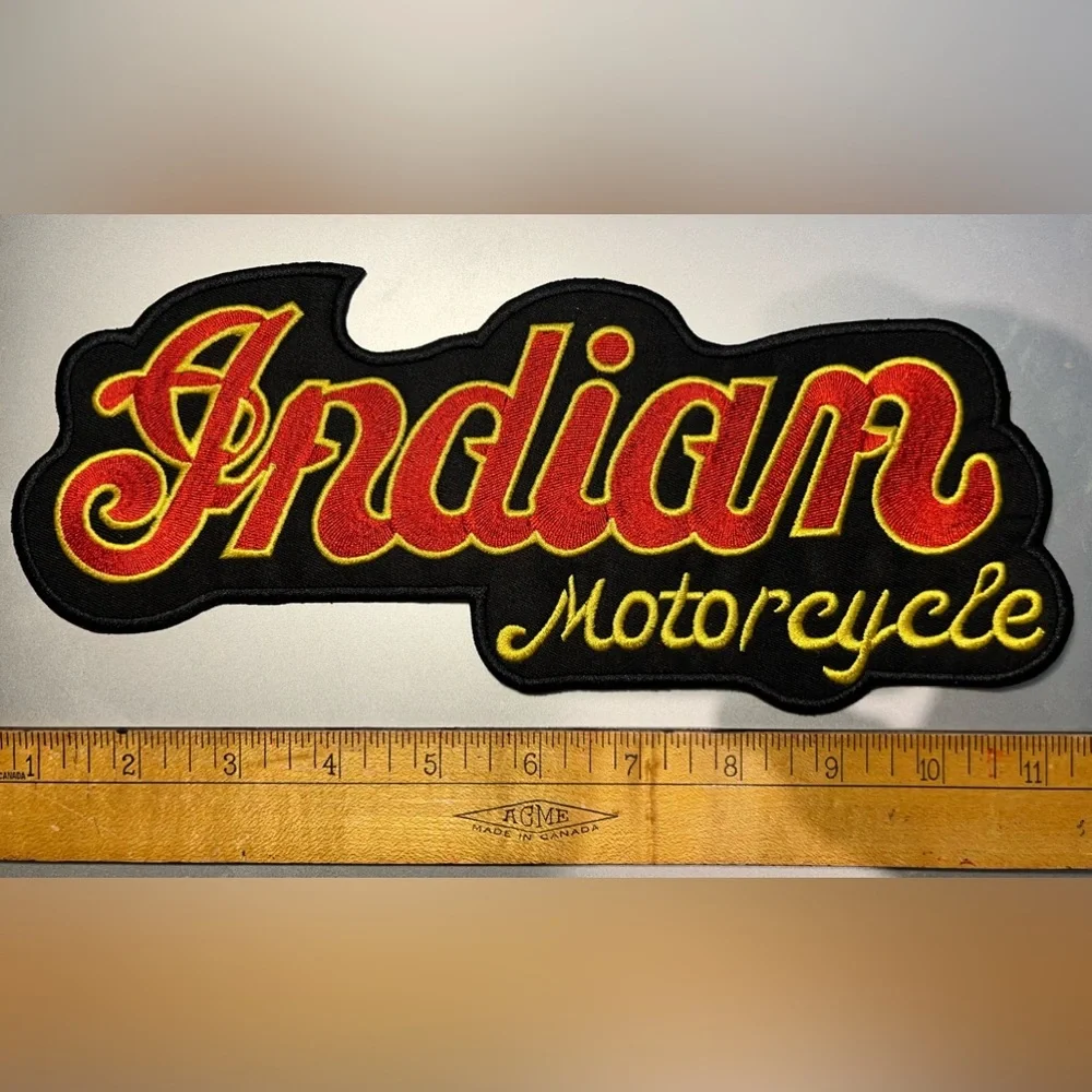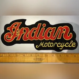 Presenting a large Indian sew on motorcycle patch. 10” x 4.5”in size. Red script with gold border.
