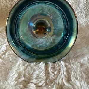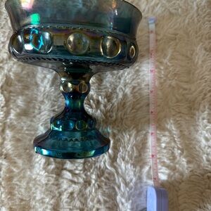 A vintage Indiana Glass "King's Crown" or "Thumbprint" pattern compote, also known as a candy dish. This piece is made of iridescent blue carnival glass.