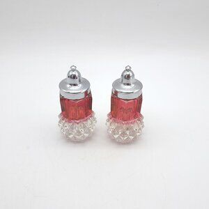 A pair of salt and pepper shakers made by the Indiana Glass Company in the US anywhere between the 1960s and 1980s in their Diamond Point pattern. The glass on their bases is in the form of diamonds and the center is in a cranberry red. The lids are still both firm and easy to unscrew.
