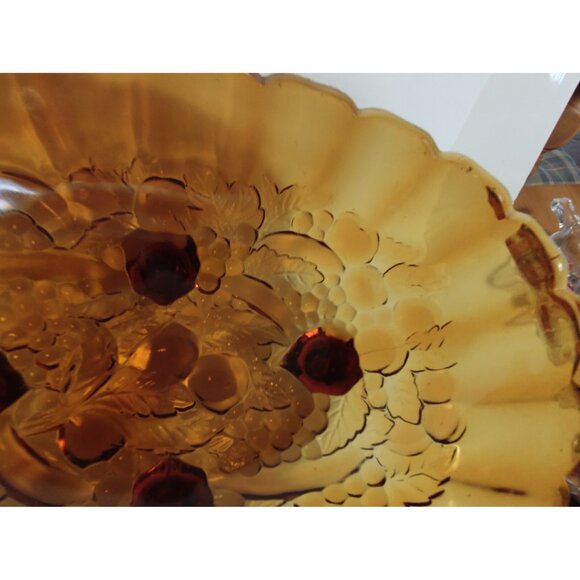 Large Indiana Harvest Grape Amber Carnival Glass Footed Oval Fruit Bowl