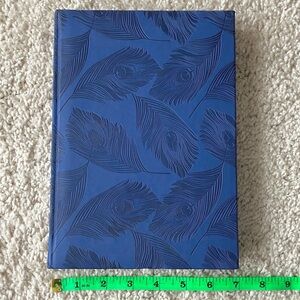New, never used! Ruled journal with ribbon bookmarks. Embossed peacock feather print on the padded cover.