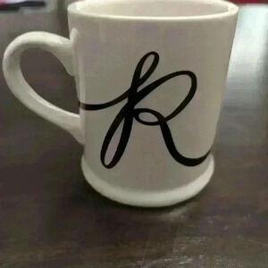 New R initial dishwasher and microwave safe mug from Indigo with marble coasters.