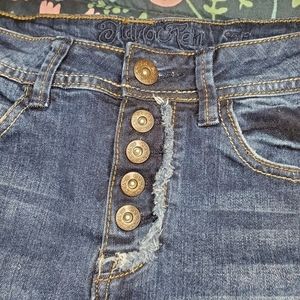 These shorts are in great condition with no visible wear or damage. They are a medium wash with a low rise. They have some distressing at the hem and fly. There are lace details on the sides.