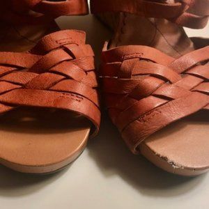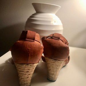 These beautiful 3.25" wedges have a unique woven jute heel that gives an 'espadrille' look. The cushioned sole is a dream to walk in, especially because of the 'talon compensé' (a subtle 0.5" platform which makes it a 2.75" heel to walk in with the beautiful leg of a 3.25" heel). The adjustable ankle strap is made of velcro and both flattering and helps secure the foot in a way that is both safe and comfortable. The rich salmon-coloured woven leather is chic and forgiving/adaptable, accommodating a wider foot if necessary. There's a ding on the left toe (see photo). Otherwise in very good condition! The size is a true 7.5. Discreetly sexy, they flatter your ankles and the angled wedge makes your foot look small. I bought them for a beach escape outfit, and was wearing them around the house indoors, but the trip was cancelled, alas!