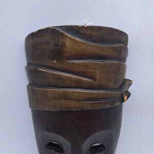 A wooden wall mask made in Indonesia. The face wears a friendly expression, a small beard and is wearing a cloth wrapped around its head. There is wear as in the pictures.