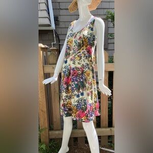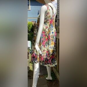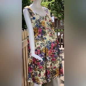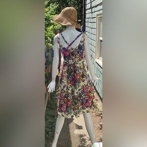 Pull on dress with side pockets. Cross straps on back, A-line skirt and ties in back. There are no fabric or size labels attached. It feels like cotton or a cotton blend. Comfortable, breathable, soft. I based the size on my measurements. Please refer to pics
