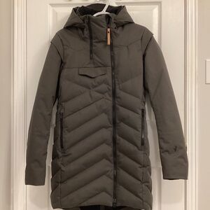 Clean, no stains or damage. Some wear on the zipper key and sleeve logo.