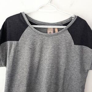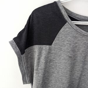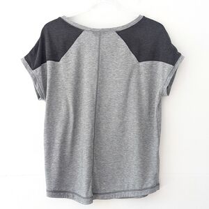 This top showcases a relaxed, obersized fit with a modern color-block design, featuring a two heather gray hues. The short sleeves and crew neckline enhance its casual, sporty vibe, making it a versatile choice for everyday wear.