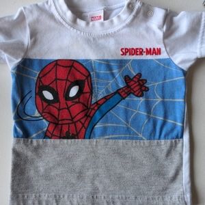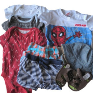 Includes Gap Sandals, the Children's Place bucket hat, 3 bodysuits, two shorts and Marvel Spider Man graphic tee (light staining on top).