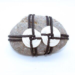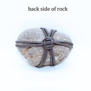 Using the traditional rock wrapping and knotting technique, I wrapped this Canadian granite river rock with 2 pieces of contrasting colour suede leather cords. The cords are tightly braided without any glue. The "8" design symbolizes infinity and eternity.