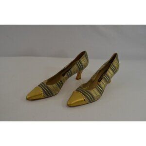 Ingledew's Grenada heels in Women's US size 9.5. Striped gold and greenish-gray. In excellent condition with some signs of wear. Please review photos closely.